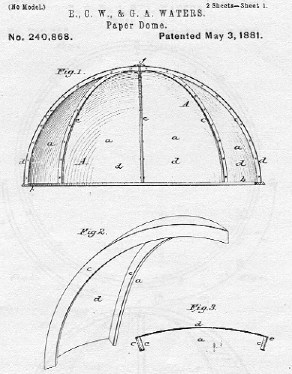 While the Waters were initially, (and exclusively,) known for boat manufacture, their minds apparently remained at work on other projects and other opportunities. In 1878, they built a paper observatory dome for the newly erected Proudfit Observatory at Rensselaer Polytechnic Institute in Troy. The construction method was almost identical to that used for paper canoes; thick linen paper was formed over a mold of a dome segment that already contained a wooden framework which was removed from the mold with the paper. Finished sections were bolted together and the joints were weatherproofed with cotton cloth saturated with white lead. The RPI dome was 29 feet in diameter and consisted of 16 sections plus a 4-foot wide shuttered opening for the telescope. It weighed 4000 pounds of which paper alone accounted for approximately 1000 pounds. The dome was supported by six eight-inch balls, which moved between grooved iron tracks and could, "be easily revolved by a moderate pressure applied directly without the aid of machinery." The dome lasted for over twenty years and was removed, not because of decay, but to convert the building to other uses in 1889